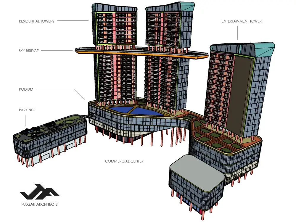 Architectural Design Concept for a Three-Tower Entertainment Resort Destination Development with Hotel, Serviced Apartments, and Casino