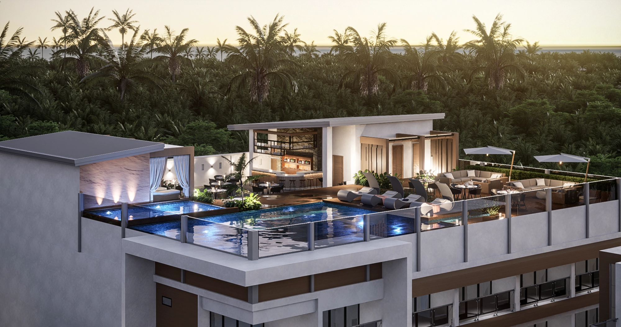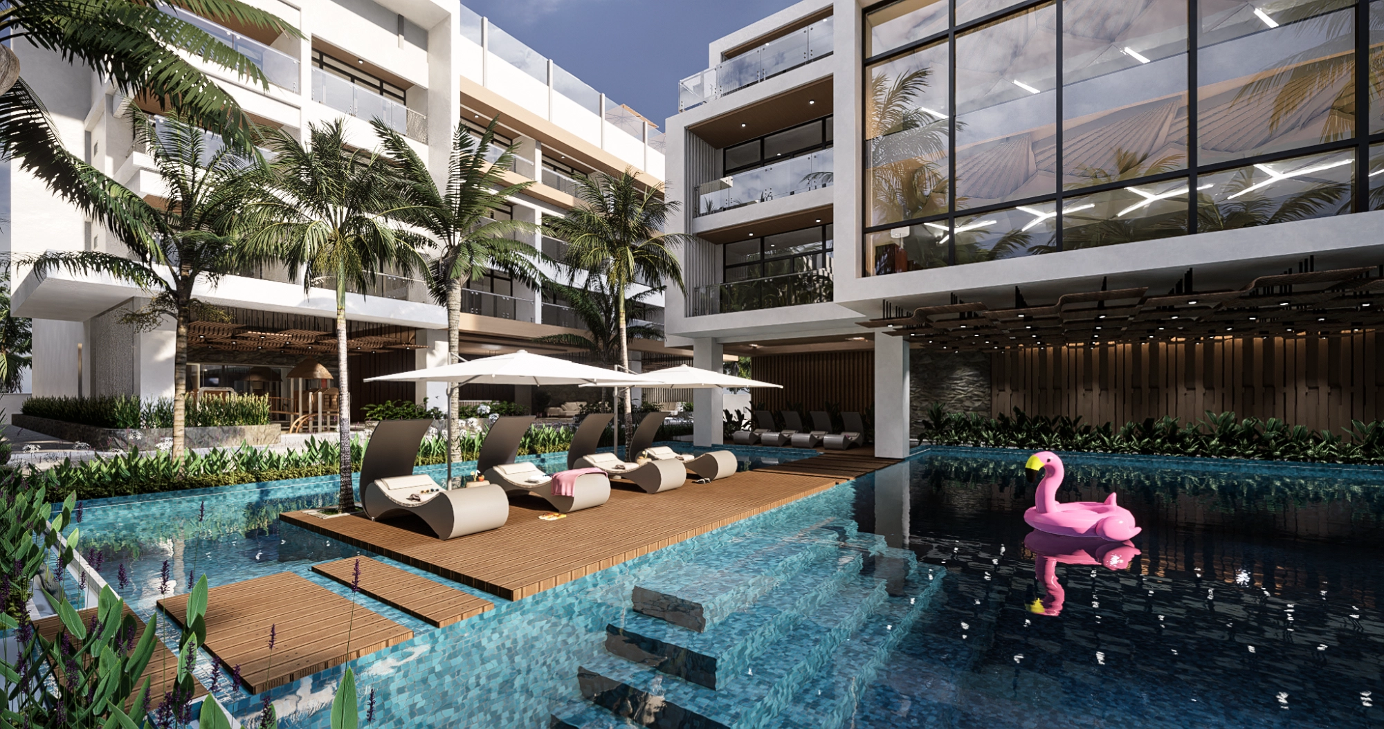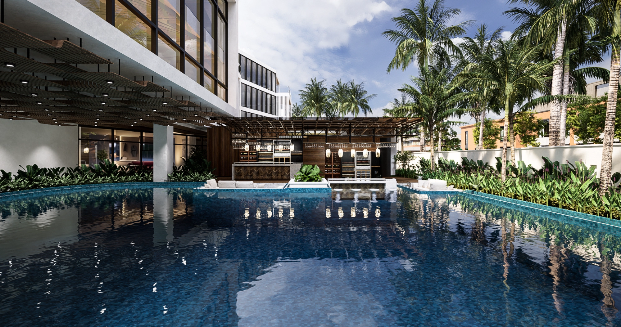 With a slim lot configuration, the development utilizes a linear design that maximizes space while maintaining an open, expansive feel. Horizontal accents stretch across the façade, visually widening the structures, while wooden louvers reduce glare from the tropical sun—an essential feature for beachfront living. The resort unfolds gradually from its understated entrance to reveal spacious pools, pocket gardens, and a multi-storey hotel complex, offering both privacy and grandeur.