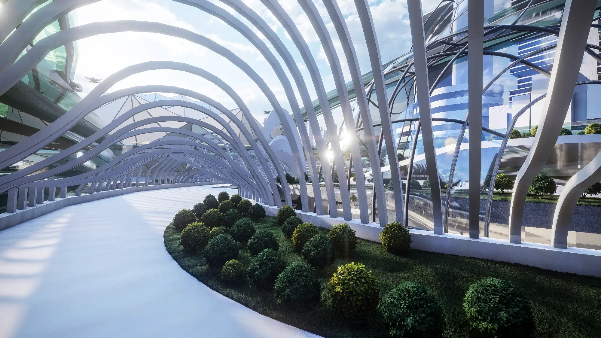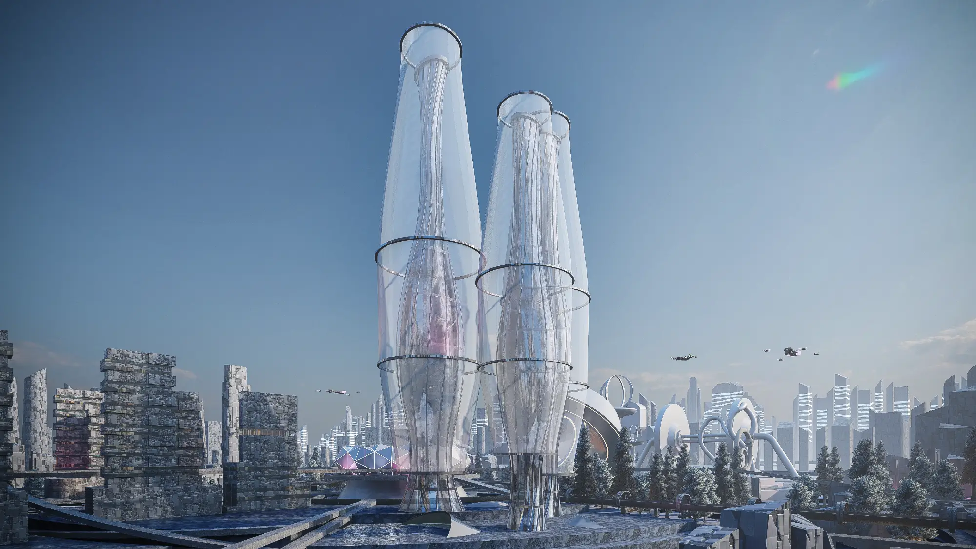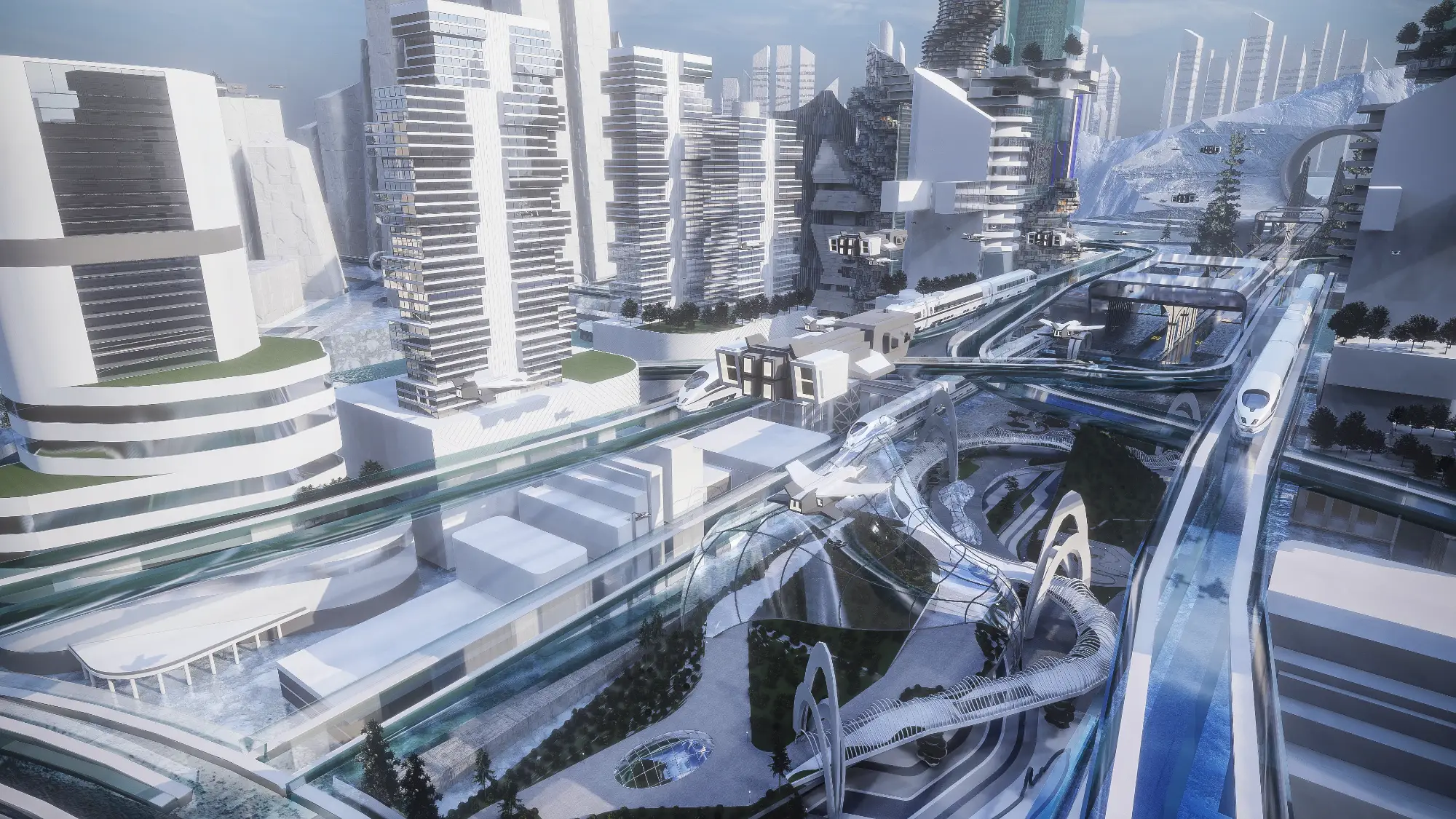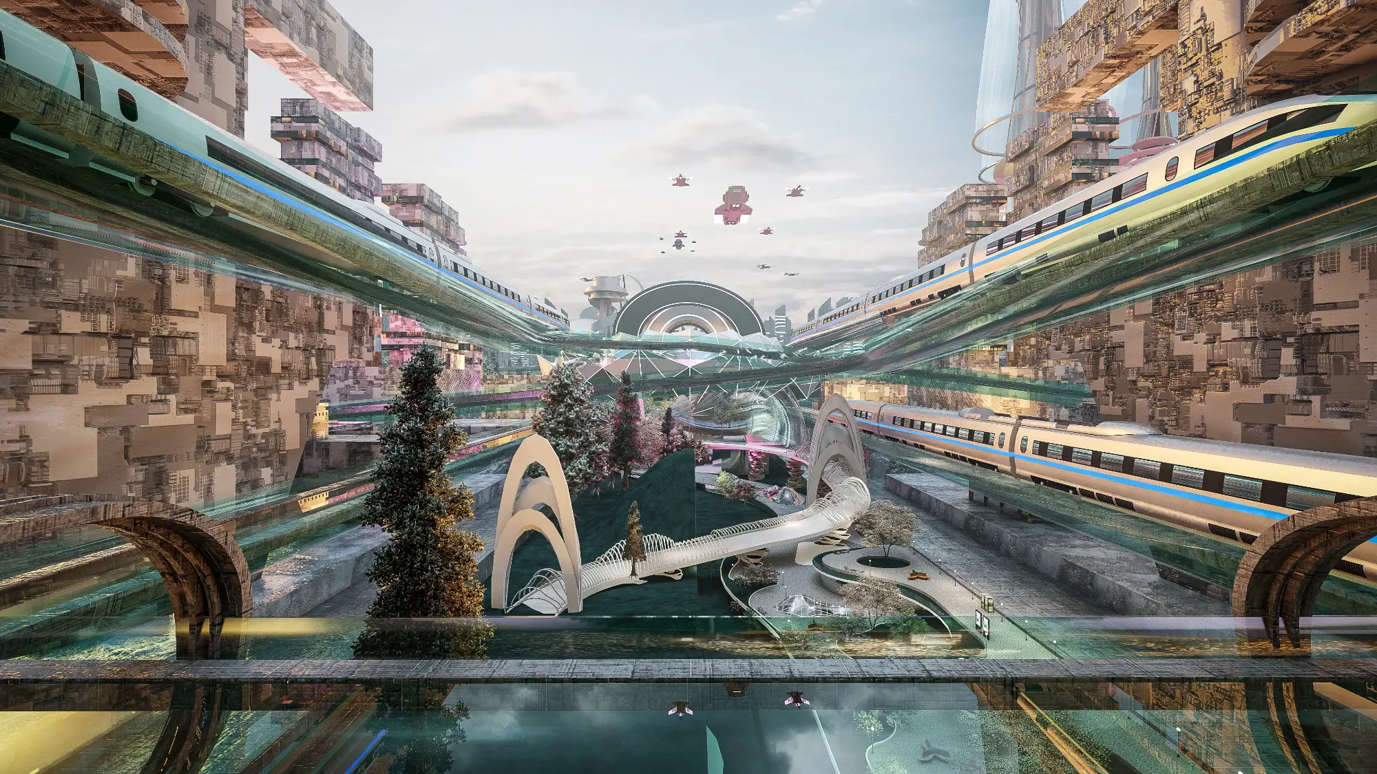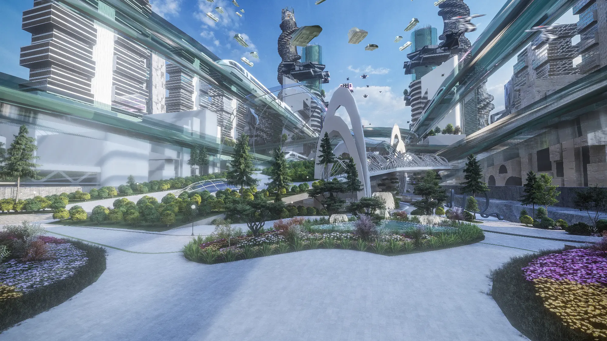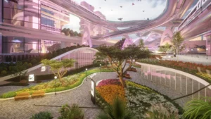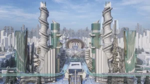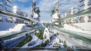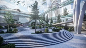 Architecturally, the Metaverse is a visual spectacle. Skyscrapers twist and bend into unfamiliar forms, their geometries unbound by gravity or construction constraints. Textures, colors, and patterns shift from zone to zone, offering a diverse and continuous sensory experience. Gateways, skywalks, and landscape elements interrupt the hardscape, creating rhythm and moments of repose within the high-density environment. Every corner of the Metaverse speaks a language of experimentation, one where form is not just liberated but expressive of a new digital spatial logic.