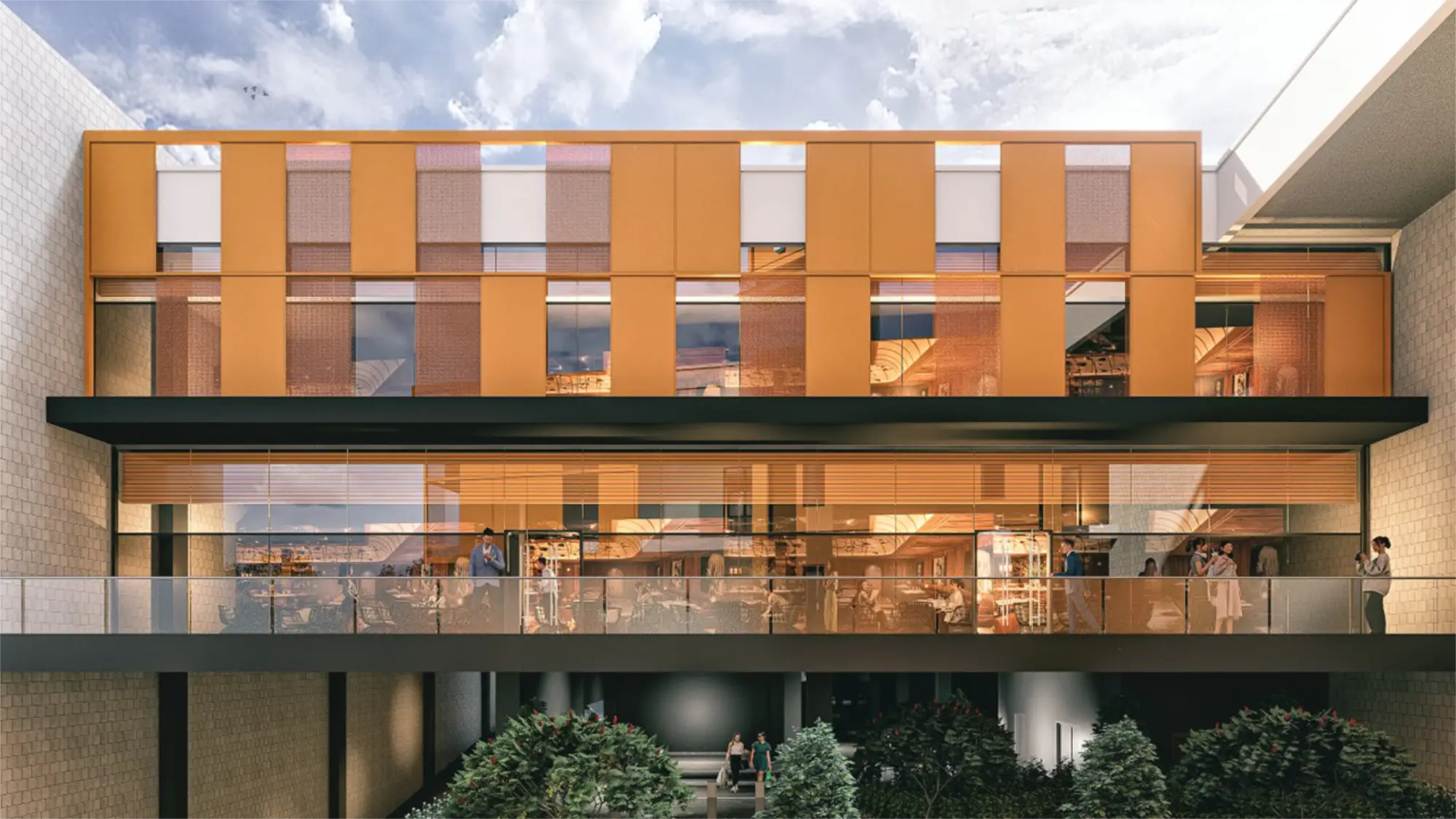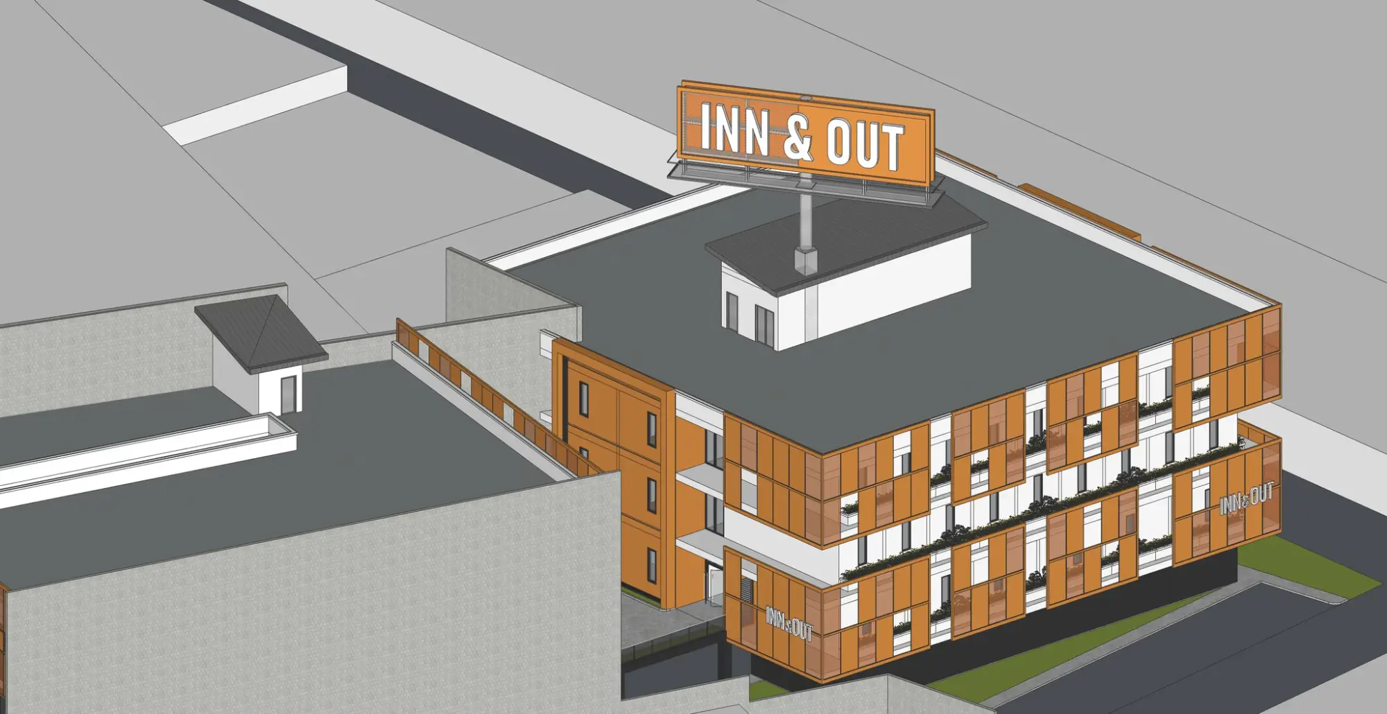 Through vibrant orange panels and rhythmic façades, this building becomes a landmark of commerce and hospitality.