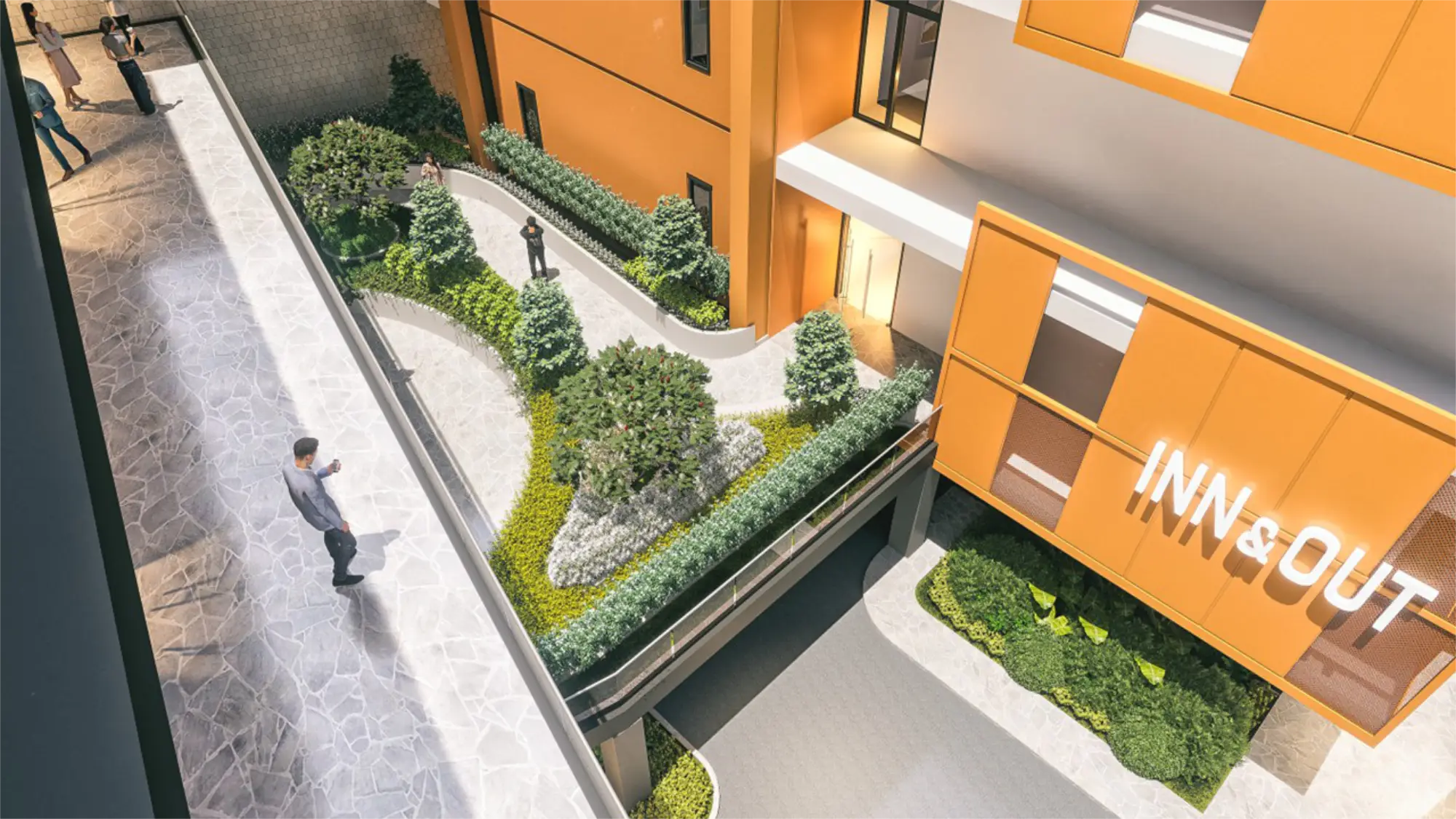 At the property’s frontage, the two-story commercial building with a roof deck offers prime real estate for retailers, restaurants, and offices seeking strong exposure to consistent daily traffic. A welcoming open courtyard strip leads visitors through the site toward a central courtyard, which serves as both a visual break and a functional separator between commercial and hospitality zones. On the second floor, a bridge connection unites the two facilities, enhancing movement while reinforcing a sense of integration across the property.